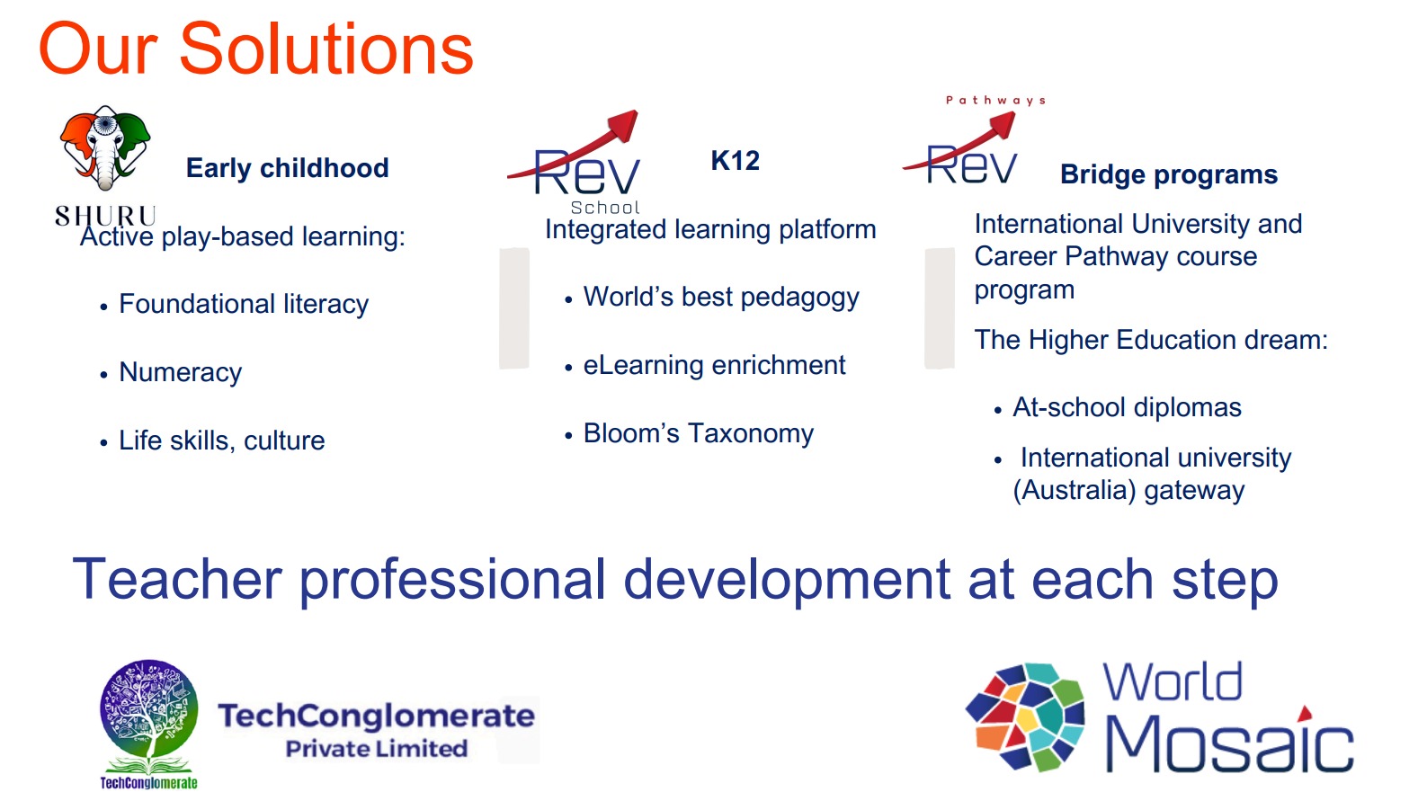TechConglomerate is here to make a difference in Education, Learning through Technology. Reimagining Education, Learning through Technology WE are a leading EdTech solution provider and consulting firm dedicated to revolutionizing education through innovative technological solutions and comprehensive professional development services. We empower students and educators by providing personalized learning paths, ongoing support, and high-quality digital resources to enhance learning experiences.